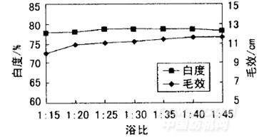 由圖7可知,浴比從1:15提高至1:20,對毛效的提高作用較明顯。此后繼續(xù)提高浴比,毛效變化不大。從白度變化曲線看,其受浴比變化的影響很小。