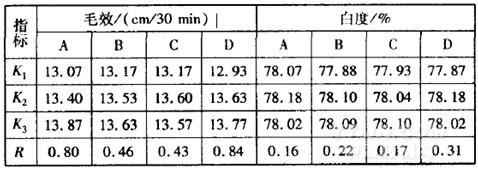 溫度。優選方案為A2B2C3D2,即TF一109質量濃度5g/L,浴比1:30,精練溫度7O℃,精練時間40min。由此可知,TF.109質量濃度對織物的毛效和白度影響均較大。權衡兩個指標,最終確定A3B2C2D3,為優化方案,即TF一109質量濃度6g/L,精練溫度為80℃,時間30min,浴比為1:30,此時毛效最高,白度值由78.32降為78.00,損失相對不大。