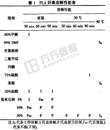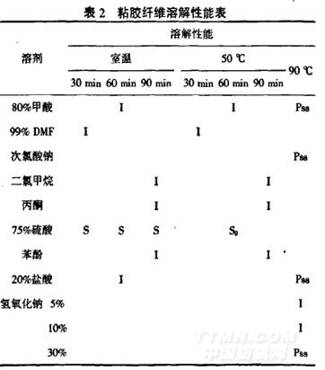 PLA纖維和粘膠纖維的溶解性能見表1、表2.