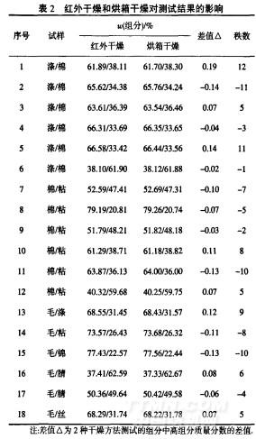 由于紅外干燥是通過熱輻射對樣品進行加熱,樣品內(nèi)部升溫較快,且通風(fēng)散熱性能差,而二組分紡織品在經(jīng)過化學(xué)溶解反應(yīng)后,在玻璃砂芯坩堝中的殘留物為濕態(tài),不適合直接紅外干燥,往往達不到快速烘干的目的.因此,在反應(yīng)后第二次紅外干燥前采用烘箱預(yù)烘干30min,并對18組常見組分樣品開展具體的試驗比對.由表2可知,對比2組分纖維含量的試驗室數(shù)據(jù),幾種干燥方法對測試無顯著性差異,再利用成對數(shù)據(jù)的秩和檢驗法進行解析.正秩數(shù)∑T=6l;負秩數(shù)∑T= -61.確定統(tǒng)計量丁的值,T=--61.確定臨界值瓦的值,死的值查秩和檢驗臨界表,樣本數(shù)N=18,在95%置信區(qū)間中,取a=0.05,則T0.05曬=47.由于T> T0.05,2種方法的測試結(jié)果差異不大,即用紅外干燥和烘箱干燥所得定量分析結(jié)果無顯著性差異.因此,紅外干燥法符合GB/T2910—2009系列標(biāo)準,紡織品2組分纖維混紡產(chǎn)品定量分析方法測試要求.