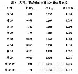 從表5中可以發現,主要纖維成分的熱重與冷重的修正系數值在1.006~1.040.其中,滌綸為1.006左右,棉為1.018左右,毛為1.039左右,粘膠為1.035左右,滌/棉混紡織物為1.014.