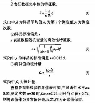 參照GBfr2910—2009中的精密度,對于混紡均勻的紡織材料,本法采用當置信度為95%時,誤差率不超過±l%.將試驗數據代人式(1)、(2),求得樣品的平均值、標準偏差,然后將試驗數據從小到大排序,將數據代入式(3),按照格魯布斯檢驗法判斷該值是否異常,如為異常值,則應舍去,最后將正常值代入式(4)、(5).
