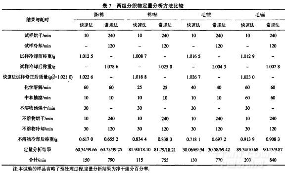 從表7可看出,快速法和常規法對定量分析結果無顯著性差異,用快速法代替常規法切實可行;滌/棉織物、棉/粘織物、毛/錦產品和毛/絲產品用快速法比用常規法可以節省640min,大大提高了工作效率.