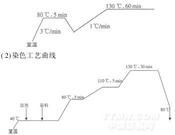絡(luò)筒→汽蒸預(yù)縮(130℃,60min)→絡(luò)筒→染色→脫水→翻筒