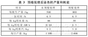 從表3可知,汽蒸預(yù)縮處理后每千克紗染色用水量可減少37.5%﹑用電減少40%﹑蒸汽減少37.5%,而每天的產(chǎn)量可提高60%。