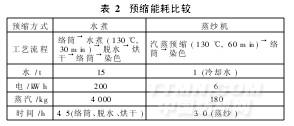 3.3 紗力拉預(yù)縮工藝與水煮預(yù)縮工藝能耗比較以預(yù)縮1000kg滌綸長(zhǎng)絲為例,對(duì)紗力拉預(yù)縮工藝與水煮預(yù)縮工藝的能耗進(jìn)行比較,見(jiàn)表2。