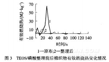 由圖3可以看出,TEOS/磷酸阻燃整理后燃燒單位質量織物所釋放的熱量明顯少于未整理樣,原因是TEOS與磷酸的協同作用改變了纖維素大分子鏈的熱裂解歷程,增加了炭化殘渣,減少了可燃性氣體的產生,說明凝聚相阻燃是TEOS/磷酸阻燃主要機理.