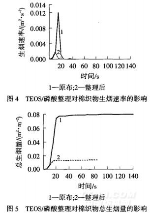 (2)經TEOS/磷酸整理后織物生煙速率顯著減小,總生煙量也由0.080m2/m2減少至0.014m2/m2,說明TEOS/磷酸阻燃整理劑具有優異的抑煙作用.