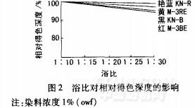 從圖2可看出,浴比在1:10—1:30內,得色深度的變化一般不超過5%(活性艷藍KN—R影響最小,活性紅M一3BE影響較明顯)。由此可見,M型、KN型活性染料,在酸性沸染條件下染錦綸中淺色時,由于腳的吸盡率高,浴比的大小對染色深度的影響較小,但需注意對拼色色光的影響。