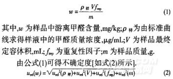 高效液相色譜法測(cè)定紡織品游離甲醛含量時(shí),影響不確定度的主要因素有:(1)標(biāo)準(zhǔn)使用液的不確定度;(2)標(biāo)準(zhǔn)曲線的不確定度;(3)樣品處理的不確定度;(4)測(cè)試方法重復(fù)性的不確定度.
