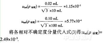 確定度根據硫酸法標定甲醛溶液的要求,硫酸溶液濃度c(1/2 H2S04)約為0.01 mol/L,而已標定的溶液濃度為0.1 mol/L,故應稀釋;另外,已標定的甲醛標準溶液也須稀釋后才能使用.10 mL單標移液管和100 mL單標容量瓶的允許誤差分別為±0.02 mL和±0.10 mL,則2者的相對不確定度分別為: