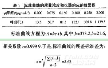標準曲線上,甲醛質量濃度和儀器響應的峰面積