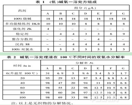 為了摸索堿氧同浴組分的合理性,將有關(guān)低堿前處理藥劑配成7組溶液(見(jiàn)表1),在100℃水浴鍋上定時(shí)測(cè)定雙氧水的分解情況,結(jié)果見(jiàn)表2。