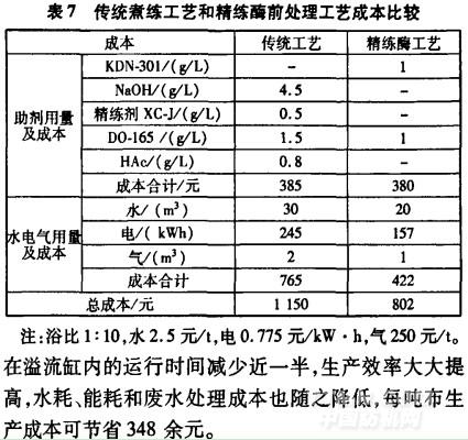 按生產1噸布計算,KDN-301低溫酶精練工藝和傳統煮練工藝的成本比較見表7。