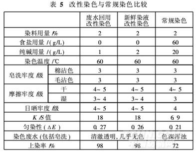 由于改性棉織物染色時無需用鹽,染料上染率為98%,因而嘗試將其染色廢水回用于改性染色,并與新鮮染液改性染色和常規染色進行比較,結果見表5。