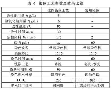 由表5知,改性后染色織物的K/S值比未改性染色織物大得多,得色明顯加深;ΔE均小0. 50,勻染性較好;改性后織物的上染率由傳統染色的72%提高到98%,染料利用率顯著提高。利用改性染色后的廢水染色,其性能指標與采用常規相當,表明改性染色廢水可以回用。