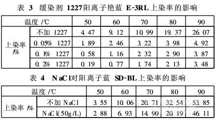 此,當達到一定溫度時,陽離子染料會逐步取代緩染劑,這樣就延緩了染料的上染速度,使染色勻染性提高。目前常用的緩染劑為1227[即陽離子型表面活性劑1227(十二烷基二甲基芐基氯化銨),又稱勻染劑TAN]。表3和表4分別為緩染劑1227和NaCl對陽離子染料上染率的影響。