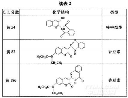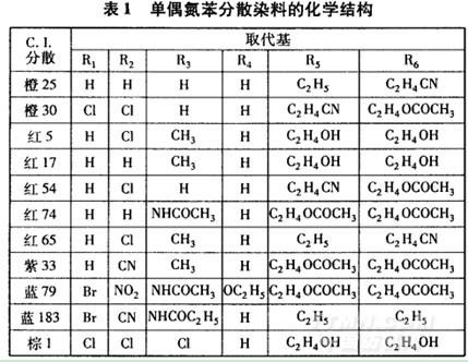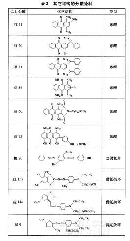 染化料 商品分散染料(部分結(jié)構(gòu)見表1和表2),碳酸鈉、醋酸、醋酸鈉、保險粉和N,N.二甲基甲酰胺(DMF,均為分析純試劑),硼氫化鈉、亞硫酸氫鈉(均為工業(yè)品),分散勻染劑Dispertex RP-131(臺灣聚益化學(xué)工業(yè)股份有限公司)
