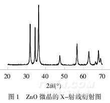 X-射線衍射:在X射線多晶衍射儀上對試樣粉末進行分析,Cu靶,電壓為40 kV,電流為40 mA,樣品的掃描范圍為20°~70°.粒徑:用激光粒度儀測試ZnO溶膠的粒徑和分布情況.掃描電鏡:采用掃描電子顯微鏡觀察ZnO粉體和整理前后真絲織物的表觀形貌.抗靜電效果:利用織物靜電測試儀,按GB/T 12703.1-2008《紡織品靜電性能的評定第一部分:靜電壓和半衰期》進行測試,測試條件為20℃,相對濕度35%.耐洗牢度:參照GB/T 3921.3-1997方法測試,洗滌條件為標(biāo)準(zhǔn)皂片5 g/L,(40±2)℃,10 min,浴比1∶50.斷裂強力:按照GB/T 3923.1-1997《紡織品織物拉伸性能第1部分:斷裂強力和斷裂伸長率的測定條樣法》測定,計算斷裂強力保留率.白度:在全自動白度儀上測試.