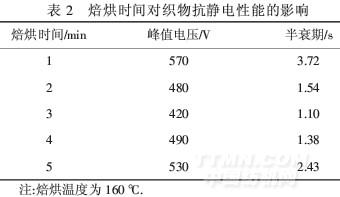 由表2可以看出,隨著焙烘時間的延長,峰值電壓和半衰期不斷降低,抗靜電性能不斷增強;3 min時峰值電壓和半衰期達到最小值;超過3 min后,隨時間的延長,峰值電壓和半衰期不斷增大,抗靜電性能減弱.原因是焙烘時間過短,整理劑在纖維表面未能形成連續導電膜;只有當時間合適,才能產生良好的抗靜電效果;時間過長,導電膜分裂,抗靜電性能下降.因此,較佳焙烘時間為3 min.