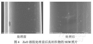 由圖4可以看出,與處理前相比,經ZnO溶膠處理后的真絲織物(160℃,3 min)表面覆蓋著一層均勻的ZnO導電膜.