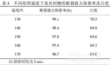 不同焙烘溫度下真絲織物的斷裂強力保留率及白度見表4.