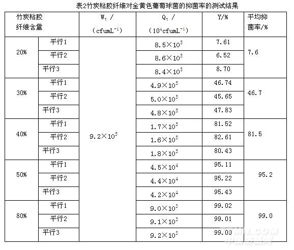 以上數(shù)據(jù)表明,竹炭粘膠纖維對大腸桿菌、金黃色葡萄球菌具有明顯的抗菌性能。當(dāng)竹炭粘膠纖維含量達(dá)到40%時,對大腸桿菌、金黃色葡萄球菌的抑菌率均已滿足GB/T20944.3–2008中的規(guī)定,分別達(dá)到91.1%、81.5%。同時可以看出,在同樣含量的情況下,竹炭粘膠纖維對大腸桿菌的抑制作用要強于金黃色葡萄球菌。
