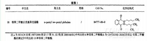 美國環境保護局在1997年提出了70種屬于環境激素的化學物質,其中有8種是鄰苯二甲酸酯,它們是DEHP、BBP、DBP、DCHP、DEP、DPP、DHP和DPRP.[5]表1列出目前各國法規中涉及的以及經研究表明對人體和環境存在危害風險的18種鄰苯二甲酸酯.