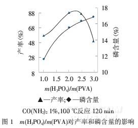 由圖3可知,隨著反應時間的延長,產率和磷含量升高,120 min時產率較高且阻燃劑顏色為白色,超過125 min以后,產率反而有所降低,可能是反應時間過長,導致產物出現脫水炭化,致使產物顏色加深.綜合考慮阻燃劑顏色,選擇120 min.m(H3PO4)/m(PVA)
