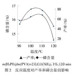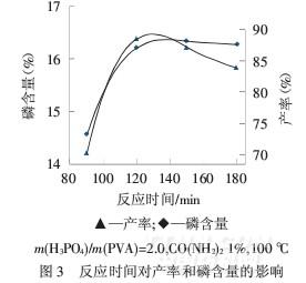 由圖2可知,隨著反應溫度升高,產率和磷含量都先升高后降低,產物顏色也逐漸加深.100℃時產率和磷含量均較高,105℃時產率和磷含量達到最高,再繼續升溫反應產物出現灰黑色,脫水炭化明顯,磷含量和產率也顯著降低.綜合考慮能源,100℃為最佳反應溫度.