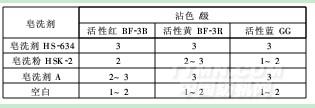 從表4可以看出,無磷皂洗劑HS-634皂洗后的防沾色能力明顯優(yōu)于堿性皂洗粉HSK-2。紅、黃、藍(lán)染色織物經(jīng)HS-634皂洗后,防沾色能力較HSK-2分別提高了1.0、0.5、1.5級(jí),較空白樣均提高了1.5級(jí);活性紅BF-3B染色物經(jīng)HS-634皂洗后的防沾色能力較皂洗