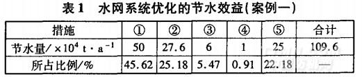 某公司年產(chǎn)3000萬(wàn)ITI各類(lèi)織物的印花、染色產(chǎn)品。主要用水設(shè)備有皂洗機(jī)、氧漂機(jī)、絲光機(jī)、水洗機(jī)、定形機(jī)、印花機(jī)等。為了減少新鮮水的取水量,減少企業(yè)運(yùn)行成本,從2000年開(kāi)始,公司就開(kāi)始對(duì)水網(wǎng)系統(tǒng)實(shí)行優(yōu)化,并取得如表1所示節(jié)水效益。水網(wǎng)系統(tǒng)優(yōu)化的總思路和具體措施如下: