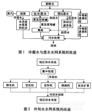 某公司[4]年產15000萬m織物,經圖1和圖2所示水網系統改造后(圖中虛線表示改造的工藝),取得節水效益見表2。