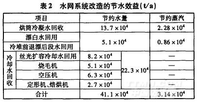 由表2可知,該公司通過水網系統的優化改造,節水41.1×104t/a,每萬米布節水27.4t,其中,冷卻水