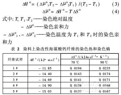 染色熱是每摩爾染料從染液轉(zhuǎn)移到纖維上所吸收的熱量,標(biāo)志著上染過程中各種分子間的作用所產(chǎn)生的能量變化,其計算采用式(3);染色熵是每摩爾染料從染液轉(zhuǎn)移到纖維上所引起的物系熵變,其計算采用式(4)[22]。根據(jù)式(3)和(4)可計算出直接染料湖藍(lán)5B上染PAMAM改性海藻酸鈣纖維的染色熱(ΔH°)和染色熵(ΔS°),所得結(jié)果見表2。