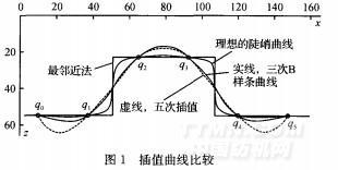 假設q(==O,1,…,5)為一組像素點的灰度值(即型值點),分別利用最鄰近法、線性插值法、五次拉格朗日插值法、三次B樣條插值法等方法求得插值曲線,如圖1所示。