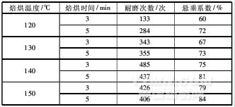 在丙烯酸酯黏合劑質(zhì)量分數(shù)為50%的情況下,改變焙烘溫度和時間,測試夜光涂層織物的耐磨性和懸垂性能,結果見表1。
