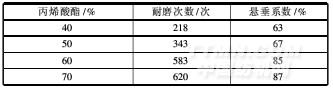 焙烘溫度130℃,時間3min,改變丙烯酸酯黏合劑的質(zhì)量分數(shù),測試夜光涂層織物的耐磨性及柔軟性,結果見表2。