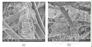 圖1為涂層織物表面發(fā)光材料的電鏡照片,圖1(a)的夜光涂層漿未經(jīng)分散處理,圖1(b)的夜光涂層漿經(jīng)超聲波分散處理。