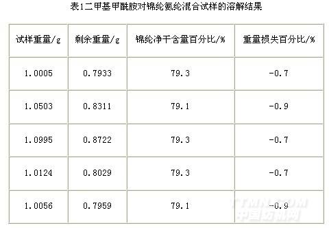 從已知干重的試樣中用二甲基甲酰胺把氨綸纖維溶解,使兩種纖維分離,將不溶纖維清洗、烘干、冷卻稱重,計算出各組分的含量百分率。