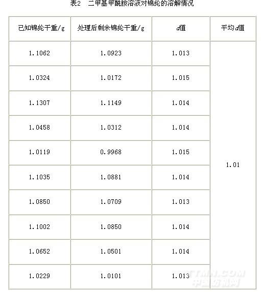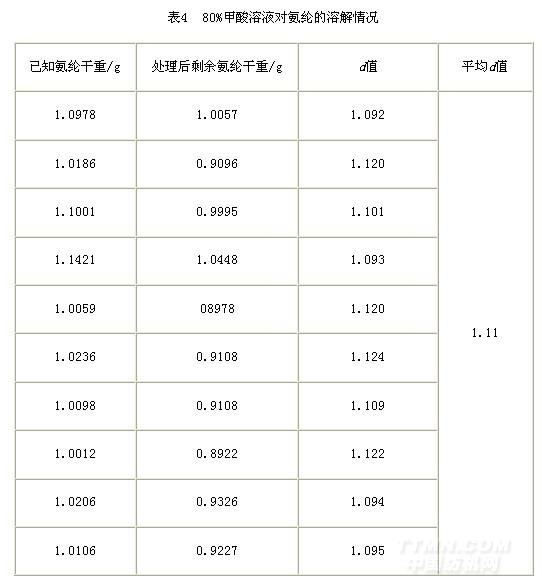從表3來看,我們在不考慮80%甲酸對氨綸的影響時,按d值取1.00進行計算,結果氨綸重量損失百分率在-1.1%~-2.5%之間。這說明甲酸溶解氨綸時對錦綸的影響較大。