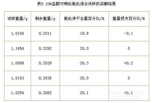 從表5來看,在不考慮20%鹽酸對氨綸的影響時,按d值取1.00進行計算,結果氨綸重量損失百分率在-0.1%~+0.2%之間。這說明20%鹽酸溶解錦綸時對氨綸基本沒有影響。