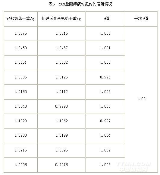 4結論 通過試驗分析可知,80%甲酸法對氨綸的影響較大,重量損失百分率在-1.1%~-2.5%之間,超出了標準允差范圍,盡管經溶解系數修正后,結果平均值可以接近真值,但誤差較大,不建議使用此方法檢測錦綸/氨綸混紡產品。三種方法中二甲基甲酰胺法、20%鹽酸法的測試結果基本接近于真實值,二甲基甲酰胺法是GB/T2910.12–2009中規定的方法,在日常檢測過程中可以優先使用,20%鹽酸法可以配合使用。