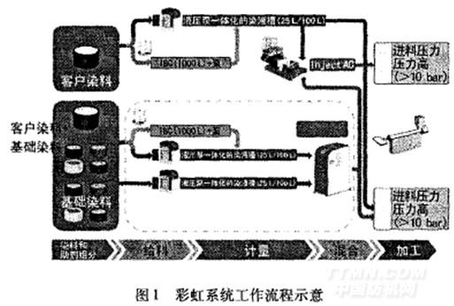 OedikonBarmag(歐瑞康巴馬格)集團自2002年起與Ro.wasol公司(樂華集團的子公司)進行深入合作。針對生產過程中液體染料的混合和給液,Barmag與Rowasol密切合作開發了“彩虹系統”。彩虹系統工作流程見圖1。