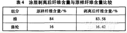 為了驗證所設定的試驗條件是否對試樣的纖維含量測試有影響,將試驗涂層織物經50LNaOH煮沸處理后,選擇二甲基甲酰胺溶解剝離改性聚丙烯酸酯涂層,依據GB/T2910.1-2009用75%硫酸溶解經剝離試驗后的改性聚丙烯酸酯涂層織物及原樣,分析結果見表4。