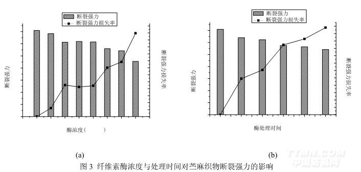 由圖 3(a)可知,隨著纖維素酶濃度的增加,苧麻織物的斷裂強力逐漸降低,特別是高濃