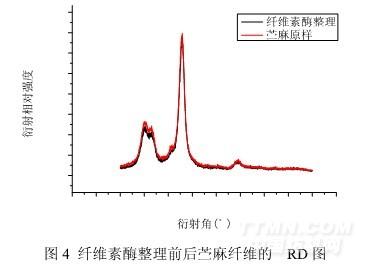 為進一步分析適度纖維素酶整理對苧麻纖維結(jié)晶度的影響,對酶處理前后苧麻纖維進行