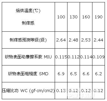 聚氨酯的成膜過程,焙烘溫度低,交聯和成膜過程可能不充分;焙烘溫度越高,聚氨酯反應 活性越高,能夠發生充分反應,但溫度過高時,結合主觀感受發現,織物手感會發硬,對降 低刺癢感產生不利影響。