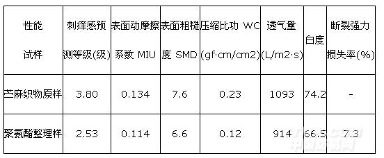 2.2.2 彈性聚氨酯整理苧麻織物的性能和形態結構分析 將苧麻織物的彈性聚氨酯整理優化工藝進行再試驗,測試織物刺癢感及透氣性能、白度