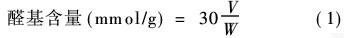 醛基含量是表示棉織物經(jīng)高碘酸鈉氧化反應(yīng)的唯一量化指標(biāo),其大小直接反映了棉織物的氧化程度。醛基含量的測定采用鹽酸羥胺溶液與氧化棉織物中醛基的定量反應(yīng),生成席夫堿,釋放出的鹽酸用NaOH溶液滴定。醛基含量按式(1)計(jì)算: